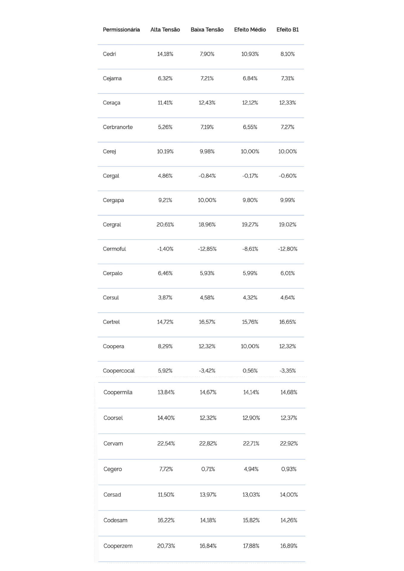 O efeito médio da alta tensão refere-se às classes A1 (>= 230 kV), A2 (de 88 a 138 kV), A3 (69 kV) e A4 (de 2,3 a 25 kV). Para a baixa tensão, a média engloba as classes B1 (Residencial e subclasse residencial baixa renda); B2 (Rural: subclasses, como agropecuária, cooperativa de eletrificação rural, indústria rural, serviço público de irrigação rural); B3 (Industrial, comercial, serviços e outras atividades, poder público, serviço público e consumo próprio); e B4 (Iluminação pública).