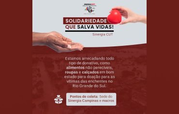 O Sinergia CUT lançou a campanha “Solidariedade que salva vidas” nesta segunda-feira (13). A iniciativa visa arrecadar donativos para as vítimas das enchentes no Rio Grande do Sul. Por questões logísticas, as doações serão concentradas na sede do Sinergia Campinas e nas suas macrorregiões. Esses pontos de coleta funcionarão de segunda a sexta-feira, exceto feriado […]