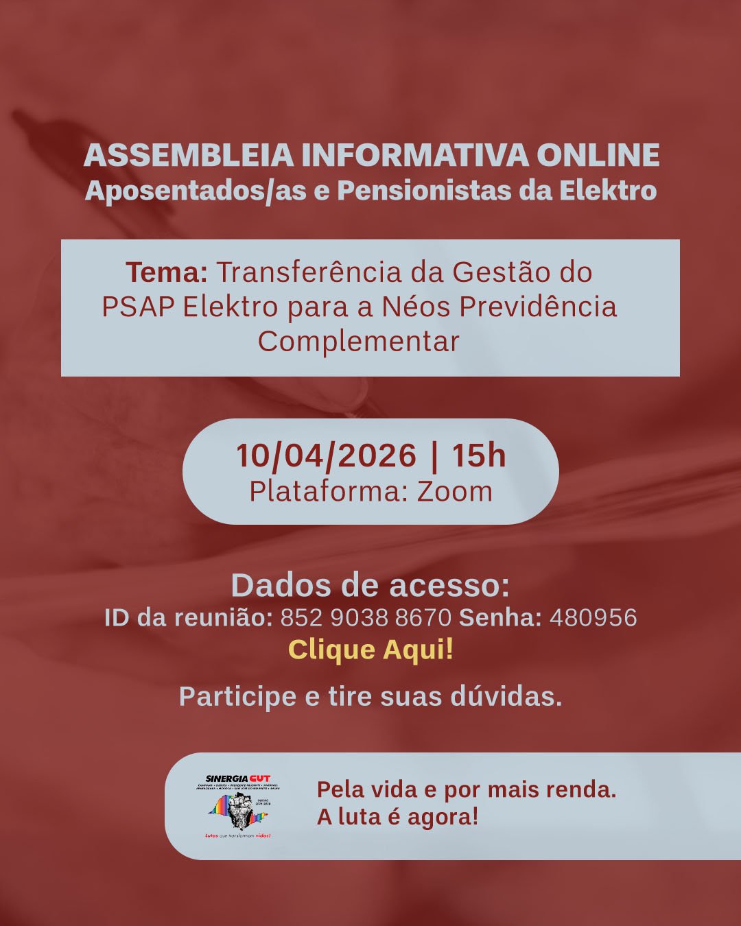 Os dirigentes sindicais do Sinergia CUT, conselheiros na Vivest e comitentes da Elektro estarão em assembleias informativas sobre o tema com os trabalhadores ativos e aposentados neste mês de abril.