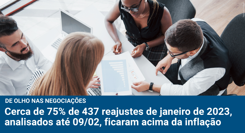 Cerca de 75% de 437 reajustes da data-base janeiro, analisados até 09/02, ficaram acima da inflação medida pelo Índice Nacional de Preços ao Consumidor, do Instituto Brasileiro de Geografia e Estatística (INPC-IBGE). O percentual é igual ao observado para dezembro de 2022, dado atualizado para esta publicação (assim como as datas-bases anteriores). Reajustes iguais ao INPC-IBGE ocorreram em 16,5% dos casos de janeiro, e abaixo desse índice, em 8,2%. Os resultados confirmam tendência de melhora praticamente contínua nas negociações desde agosto de 2022. Leia o estudo abaixo na íntegra.