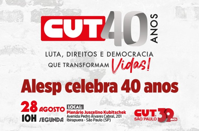 A Central Única dos Trabalhadores e Trabalhadoras (CUT) completa 40 anos no dia 28 de agosto e para comemorar sua história de resistência, lutas e conquistas para a classe trabalhadora, o deputado estadual Luiz Claudio Marcolino (PT) homenageia a entidade sindical em Sessão Solene às 10 horas, no Auditório Juscelino Kubistchek na Assembleia Legislativa de São Paulo.