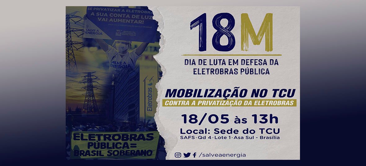Amanhã, 18/05, nós eletricitárias e eletricitários de todo o Brasil estaremos na porta do TCU e das nossas sedes por todo Brasil, unidos em consolidação de forças com parlamentares guerreiros, movimentos sociais, outras estatais, servidores e familiares. É preciso, acima de tudo, ter coragem e espírito republicano para combater interesses nefastos e entreguistas! Vamos derrotar estes covardes, companheiros!