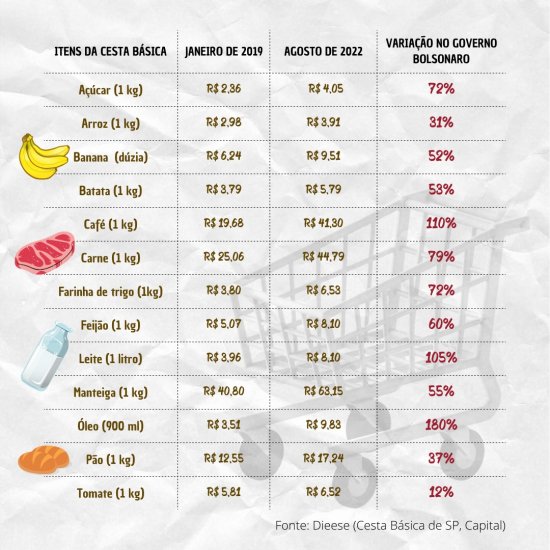 A alta de produtos básicos entre 2019 e 2022, como o óleo, que subiu 180%, o café (+110%) e o leite longa vida (+105%) pesam muito no bolso de todos os brasileiros, em especial dos mais pobres, conforme dados da pesquisa de preços da cesta básica, realizada pelo Departamento Intersindical de Estatísticas e Estudos Socioeconômico (Dieese), que podem ser conferidos na tabela abaixo.