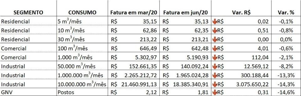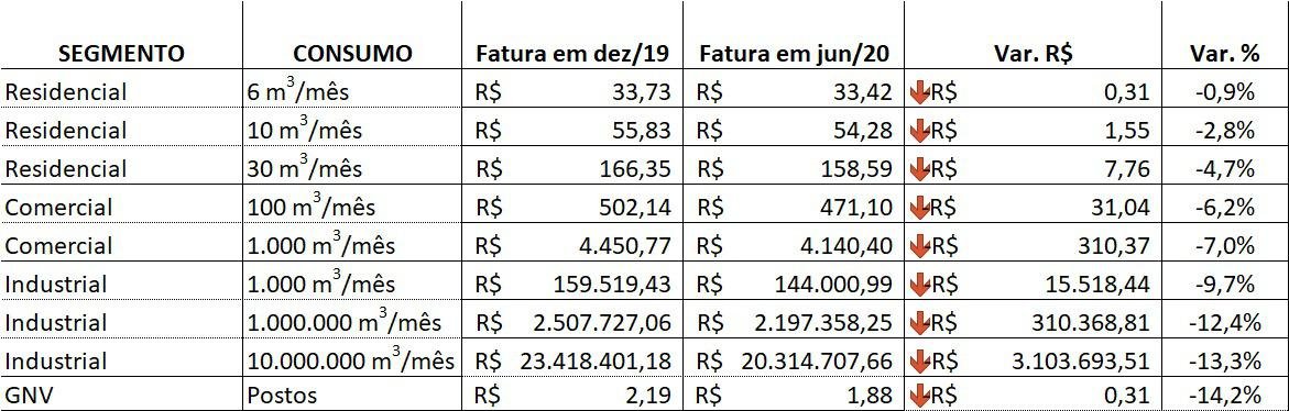 A tarifa dos usuários de gás canalizado é composta de margem de distribuição e custo do gás. A margem de ambas as concessionárias, conforme o Contrato de Concessão, foi reajustada em 6,2%, o que corresponde à variação do IGP-M entre maio de 2019 e abril de 2020, descontada de um fator de compartilhamento de ganhos de eficiência da concessionária, o Fator X. A parcela do custo do gás considera as condições dos contratos de suprimento entre concessionária e Petrobrás. A parcela foi reduzida, refletindo as quedas observadas nos preços internacionais do petróleo ao longo dos últimos meses.