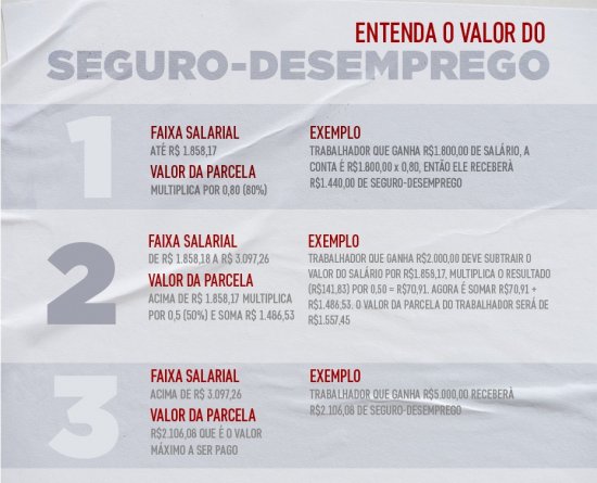 O valor do seguro-desemprego é calculado com base na média salarial dos três meses anteriores à dispensa. O valor nunca poderá ser inferior a um salário mínimo (R$ 1.212) e nunca maior que o teto de R$ 2.106,08. O valor maior é pago aos trabalhadores com salário médio acima de R$ 3.097,26.